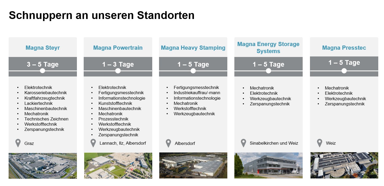 Im Rahmen der Berufspraktischen Tage der 8. und 9. Schulstufe hast du bei uns die Gelegenheit, dir ein genaueres Bild deines Wunschberufes und einer Lehre bei Magna zu machen.